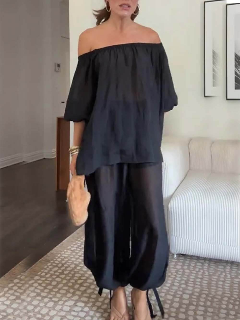 Lightweight chiffon lantern pants with an elastic waist and tie detail, offering effortless comfort and chic casual style.